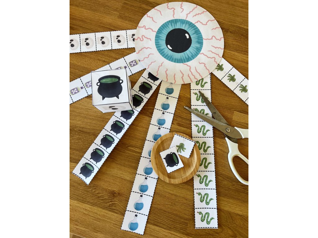 Děti hází hrací kostkou a následně si ustřihnou obrázek, který jim padl. Vítězí ten, kdo od určitého obrázku nasbírá nejvíce kusů.
