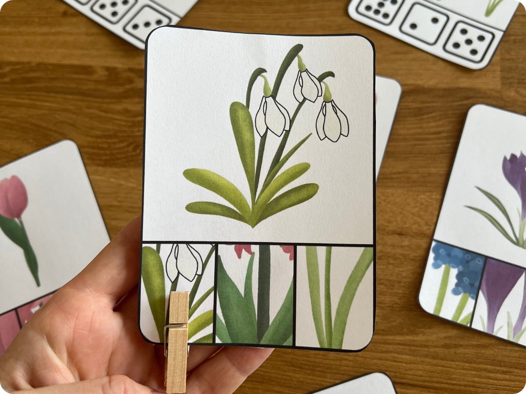 Aktivita obsahuje 31 kolíčkovacích karet s jarními květinami.