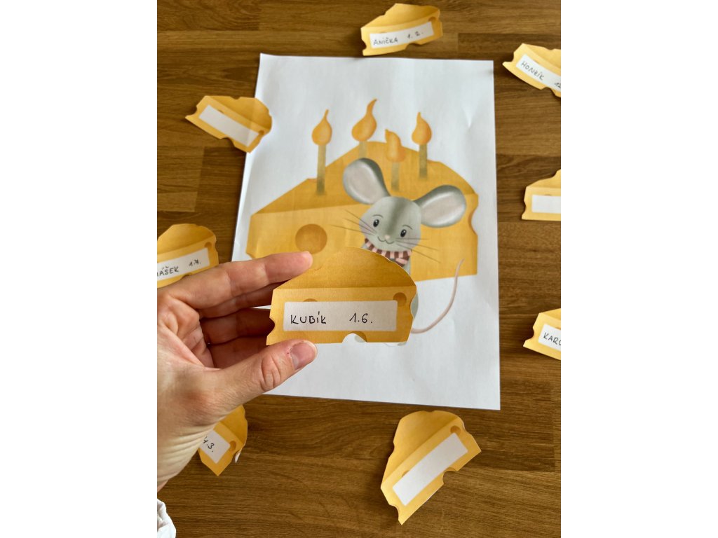Cedulky ve tvaru sýra pro dopsání jmen a dat