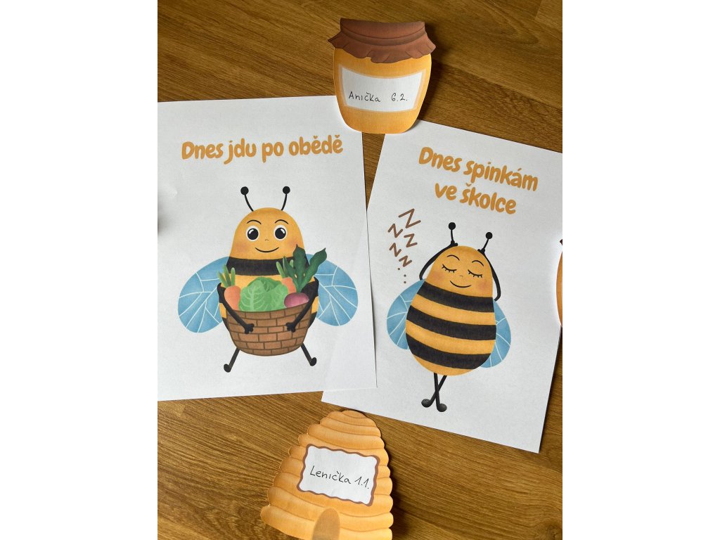 BONUS: Cedulky s včelkami– „Dnes jdu po obědě“ a „Dnes spinkám“, které pomohou s orientací během dne.