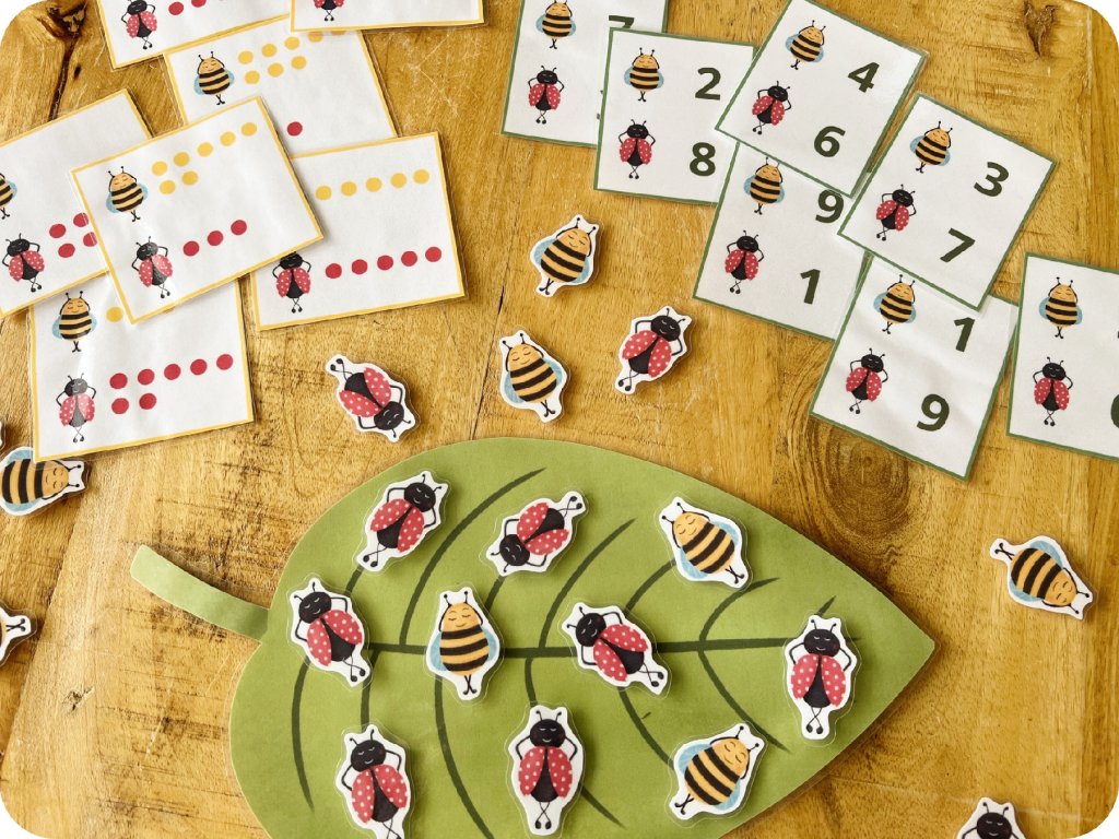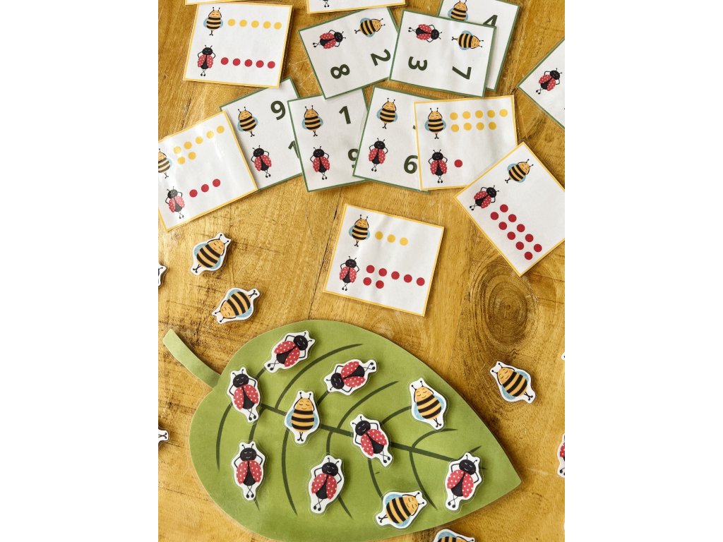 Možnosti využití: Materiál je variabilní. Pro mladší děti využijte karty s puntíky (vizuální opora), pro starší předškoláky, nebo malé školáky karty s číslicemi. Vystřižené dílky jsou ideální i pro smyslové boxy (sensory play) – např. hledání hmyzu v zelené rýži, čočce či jiném sypkém materiálu.