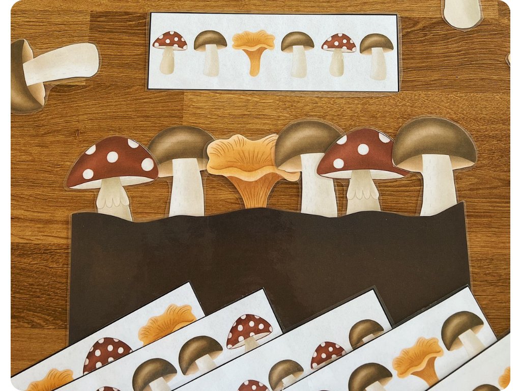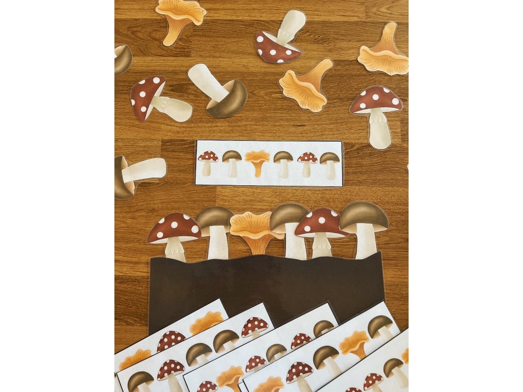 Děti sází houby do hlíny v pořadí podle předlohové karty. Rozvíjí prostorovou představivost a schopnost logického myšlení.