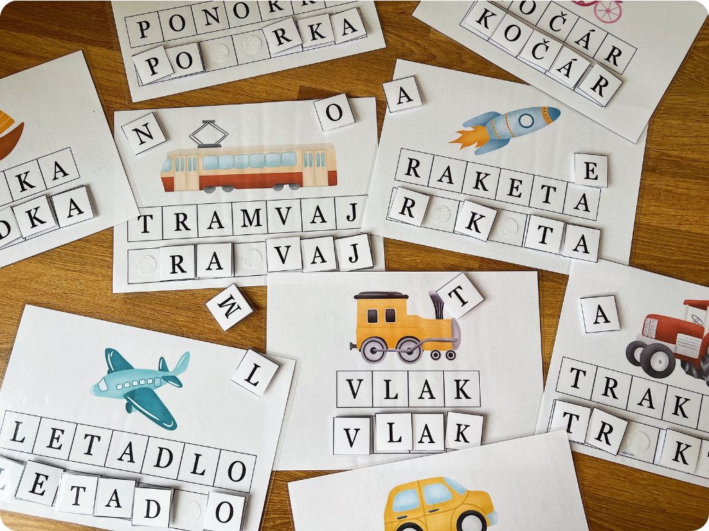 V souboru najdete 12 karet s dopravními prostředky a 58 čtverečků s písmeny, které dětem pomáhají hravou formou procvičovat skládání slov.