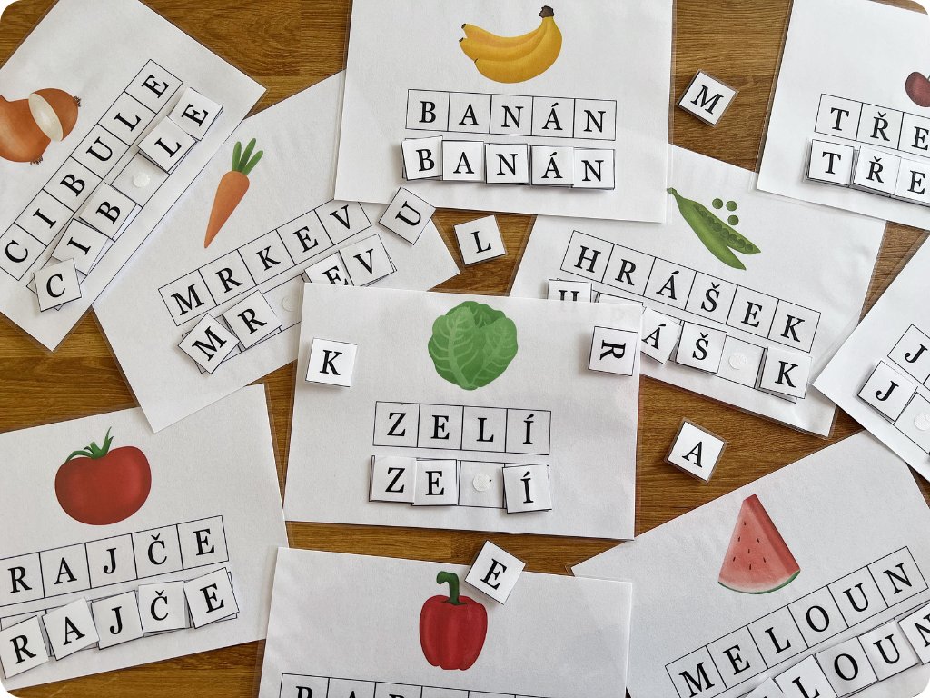 Každá karta obsahuje obrázek ovoce nebo zeleniny a napsaný název, který děti skládají do prázdného řádku pomocí jednotlivých písmen na čtverečcích.