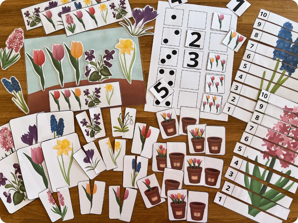 6. Karty s obrázky květin - tulipán, modřenec, krokus, hyacint, fialka, sněženka, narcis
